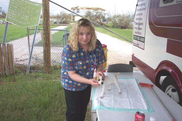 The summer of 2004 is one that Floridians will always remember. Four hurricanes caused chaos as they ripped through Florida's coastal and inland towns, and changed the meaning of hurricane preparedness forever. After Hurricane Charley devistated the Punta Gorda area, Dr. Jo Ann Daniels responded to administer aid to the animal victims of the storm. Together with numerous volunteers from all over Florida, Dr. Daniels provided examinations and treatment of injured and sick pets, strays and wildlife. These included injuries such as lacerations, eye ulcerations, heat exhaustion, and dehydration. The local shelters worked with the national rescue agencies to provide a disaster relief triage site, shelter, supplies, and care to lost and injured animals. They were also instrumental in reuniting pets with their owners by scanning each animal for a microchip and tracking the descriptions and locations of found pets.